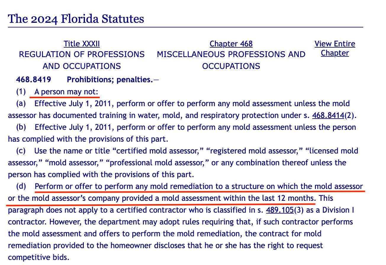 - Conflict of interest: Florida law mandates a strict separation between the assessment and remediation stages of mold removal to uphold integrity and protect property owners. By preventing assessors from performing remediation on the same property, the law eliminates any potential for financial gain based on exaggerated findings. This safeguard ensures that assessors provide honest, unbiased evaluations, fostering trust and transparency in the mold remediation process.