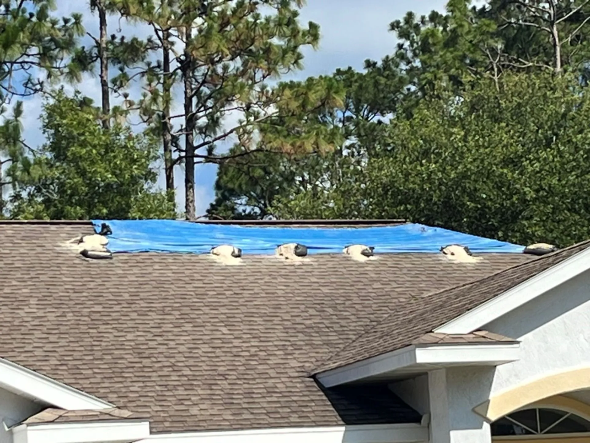 We tarped the roof with 6 mil plastic to cover the damaged areas. We also used sandbags to hold the tarp in place as opposed to nails. Sandbags reduce further damage, but more importantly, they allow PUDDLES to remove the tarp show your insurance adjuster the damages without placing more holes in your roof.